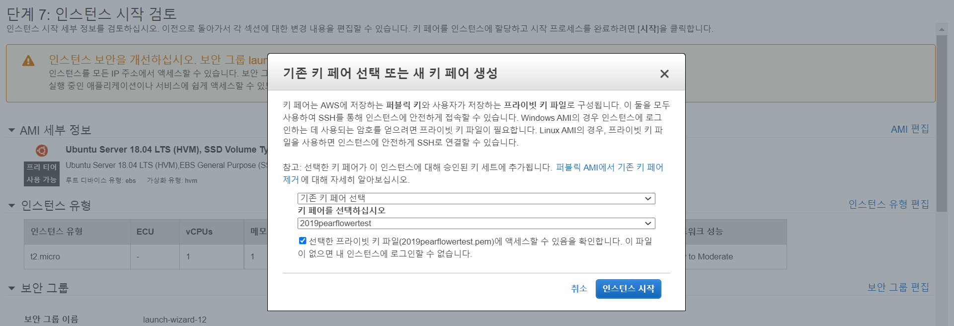-> '키 페어 선택' 창이 뜨면 '기존 키 페어 선택' 후 이전에 만들어뒀던 키 페어를 선택.