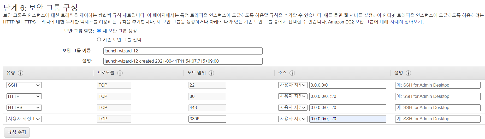 단계 6: 보안그룹 구성 에서 아래와 같이 규칙 추가