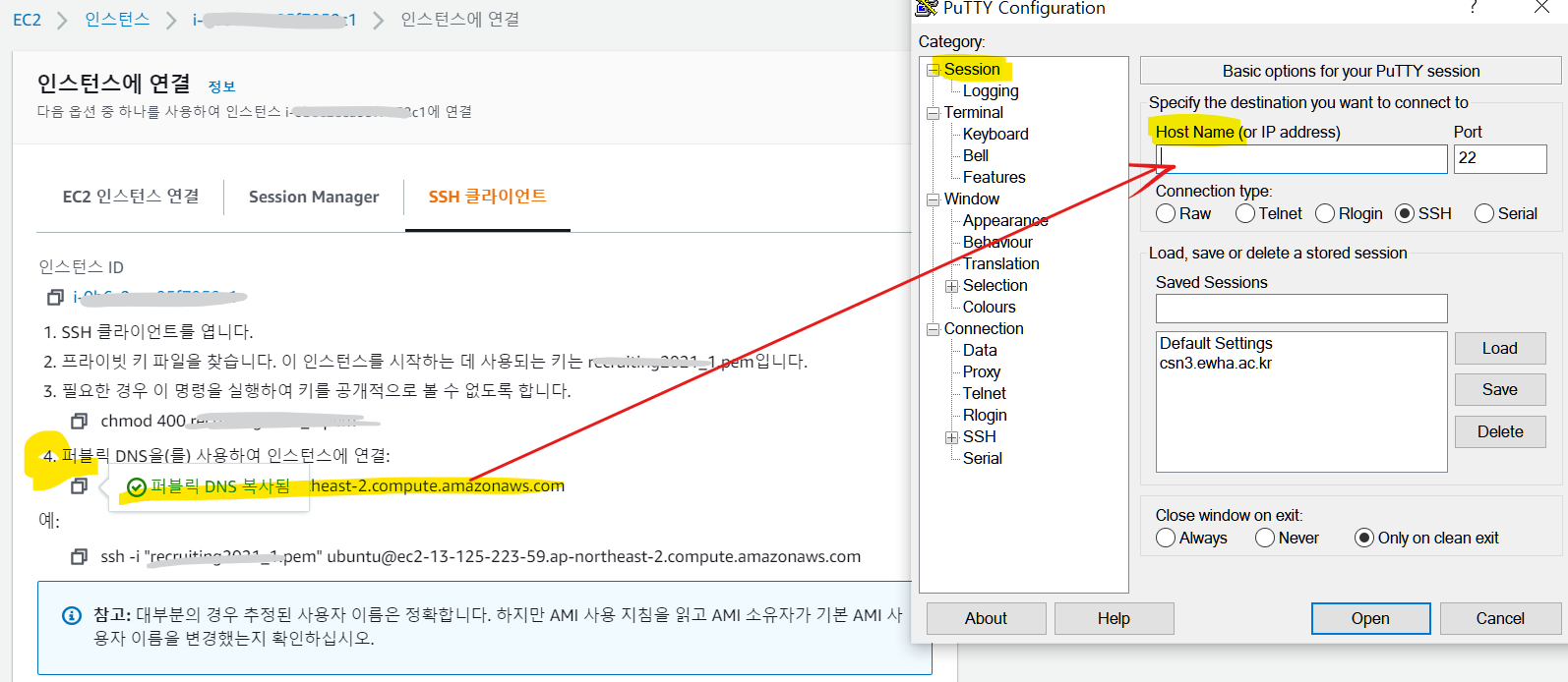 ubuntu@{퍼블릭 DNS} (아래 사진 참고)