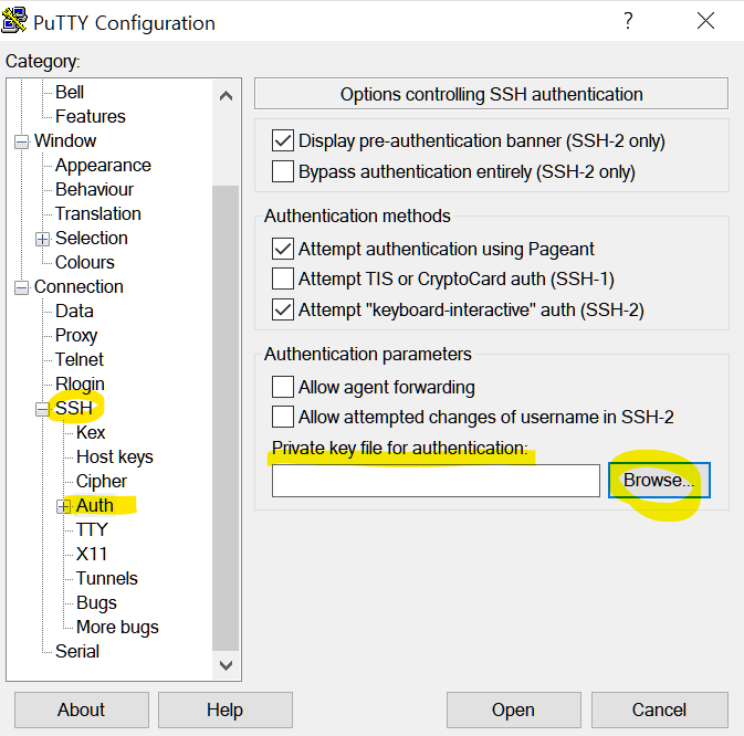 Connection > SSH> Auth 창으로 이동하여 다음 작업을 완료합니다.